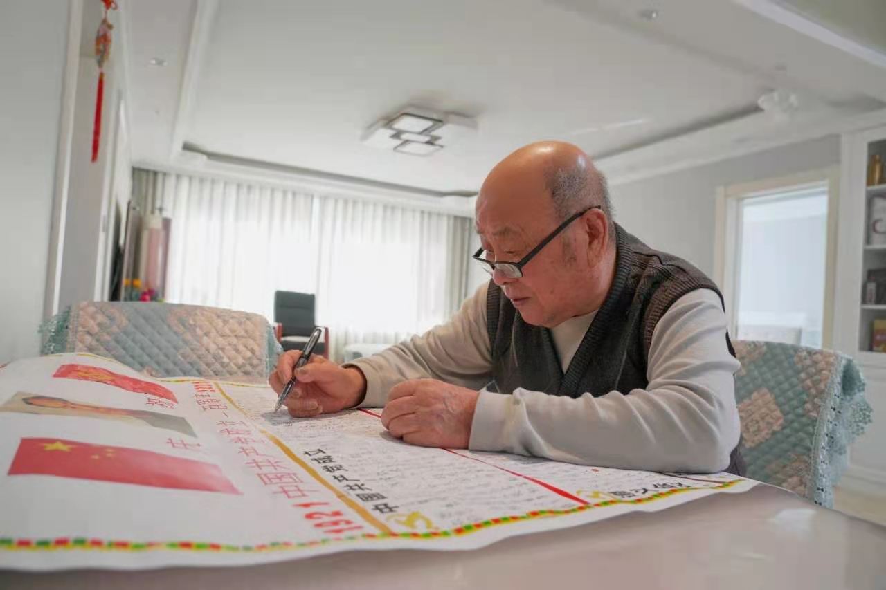洮南市91岁高龄的抗战老兵宋登岭,用自己设计并书写的“庆祝中国共产党成立100周年”海报,抒发着一位抗战老兵对中国共产党无比忠贞和深沉的爱,对今日幸福生活发自内心的歌颂与感恩。
