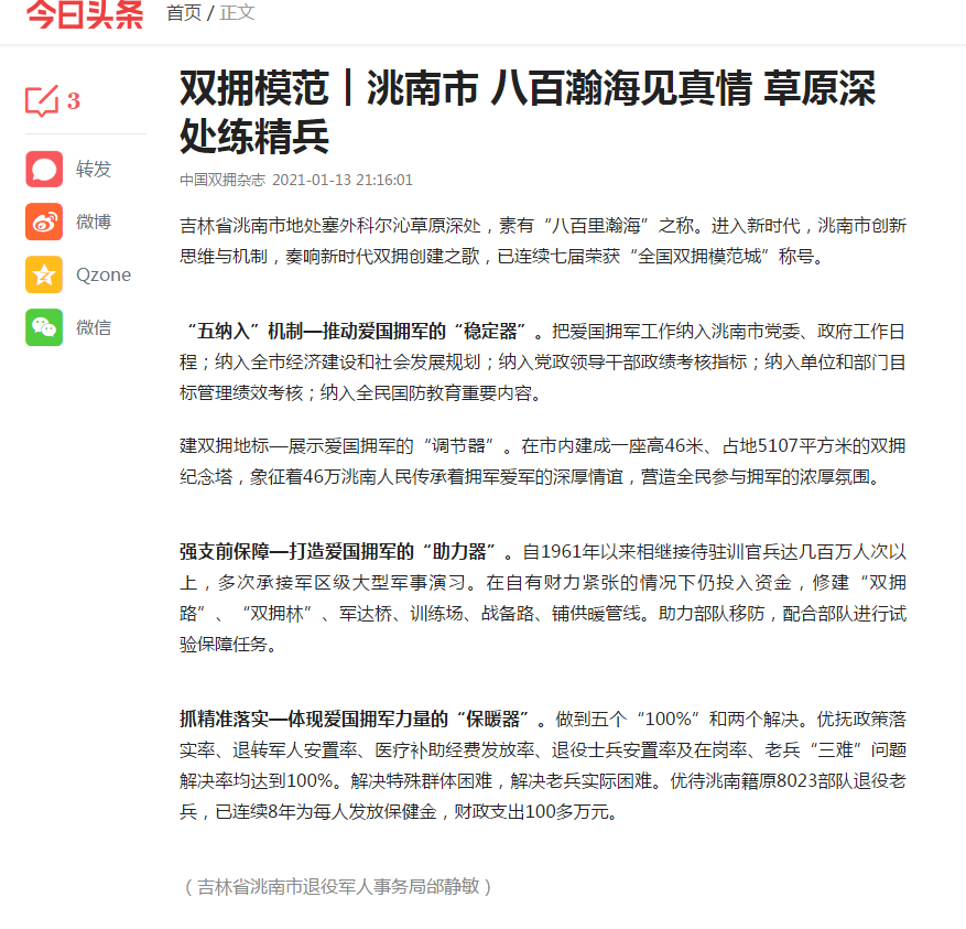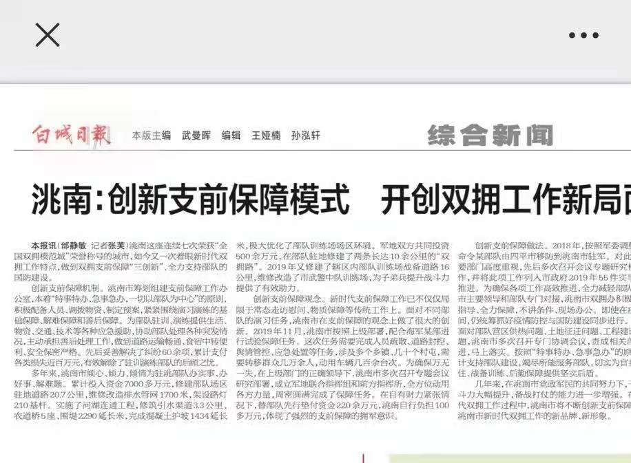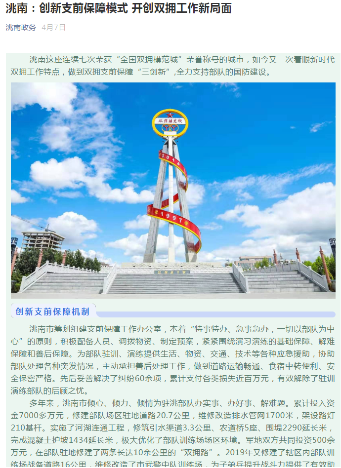 建立军地需求双清单制度,完善军地联席、专题协商、情况通报等各项制度,坚持以服务部队备战打仗为主线,探索共建路径,寻求切入点,有效推进洮南市新时代双拥工作创新发展。